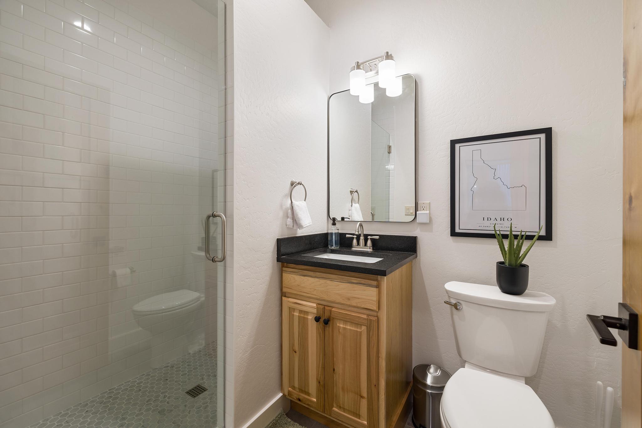 Bathroom: Accessible through Guestroom 1, this private en-suite bathroom boasts a walk-in shower, single sink vanity, and toilet. Towels and bathroom amenities are thoughtfully provided for your stay.